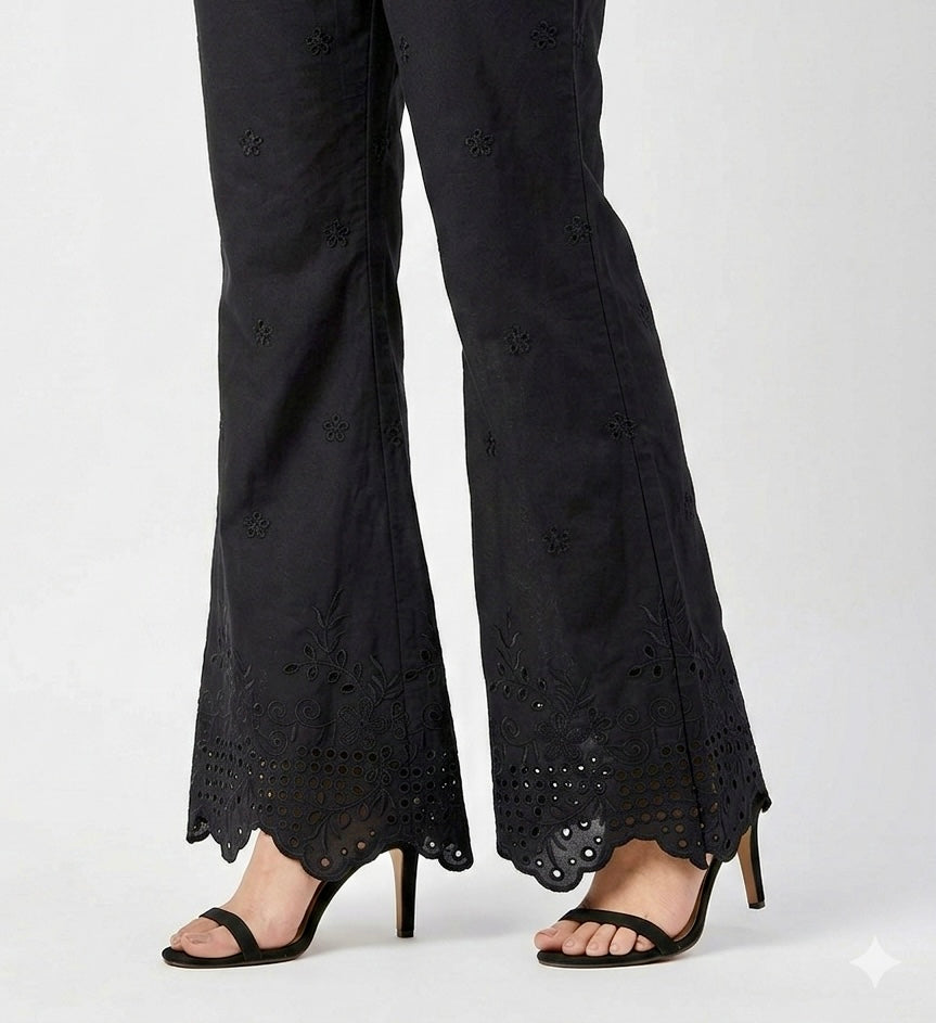 Elevate your everyday style with these Black Schiffli Embroidered Flared Trousers. Featuring intricate eyelet detailing and a delicate scalloped hem, these pants offer a sophisticated blend of texture and modern silhouette.