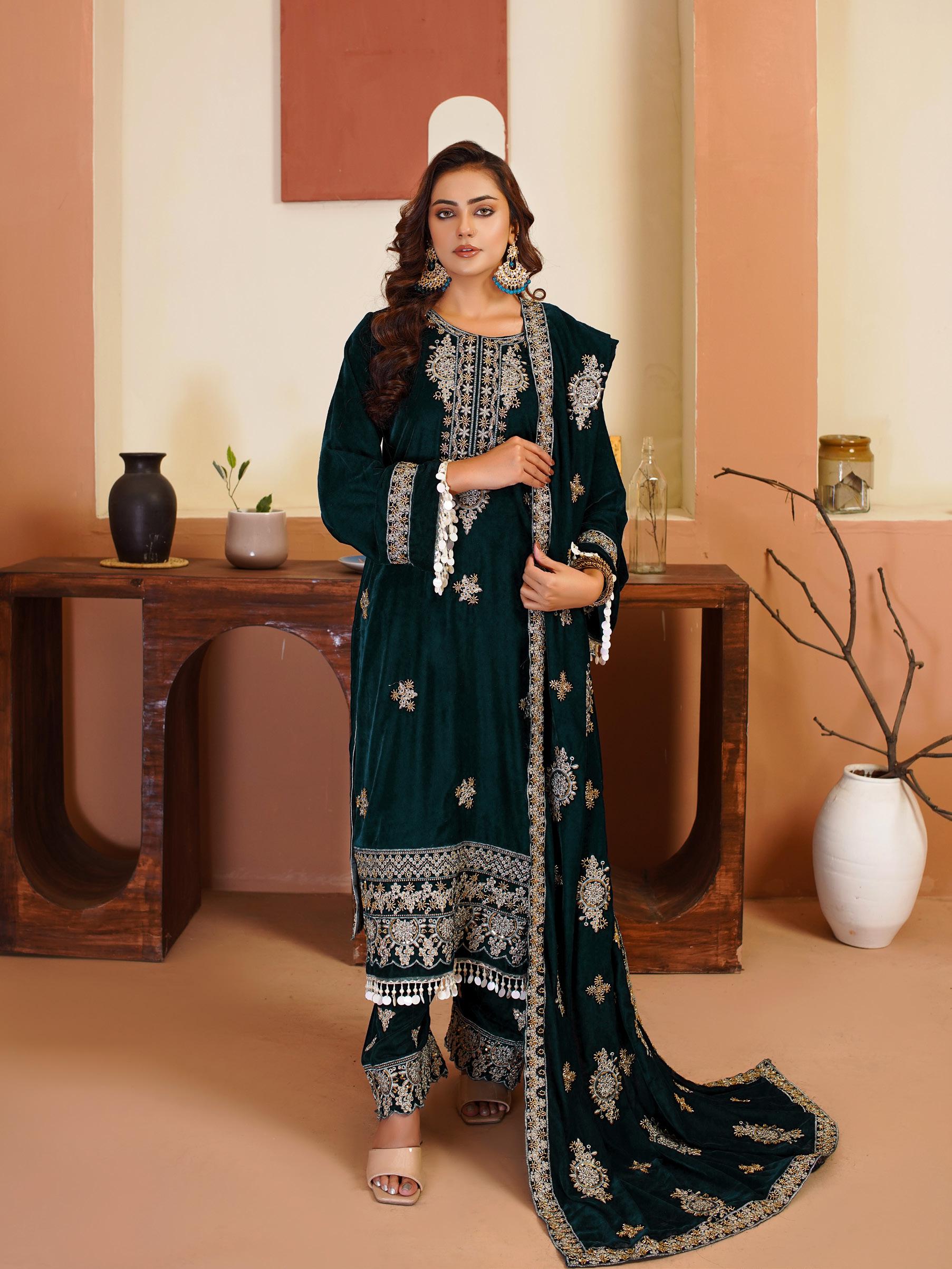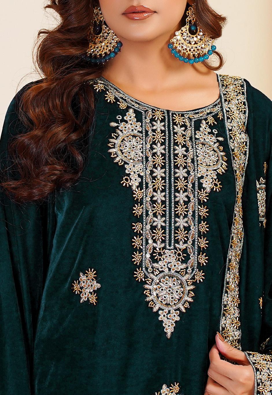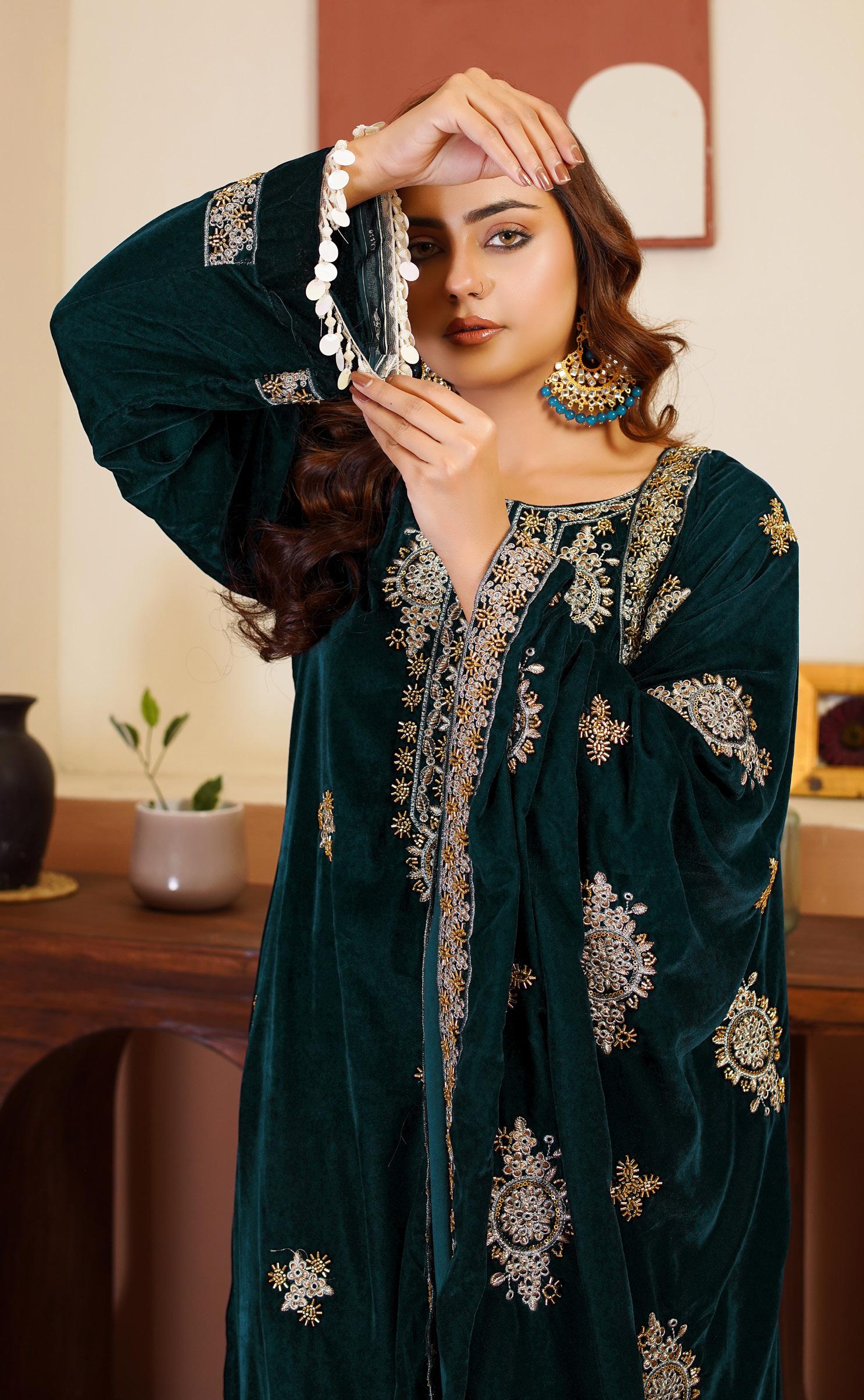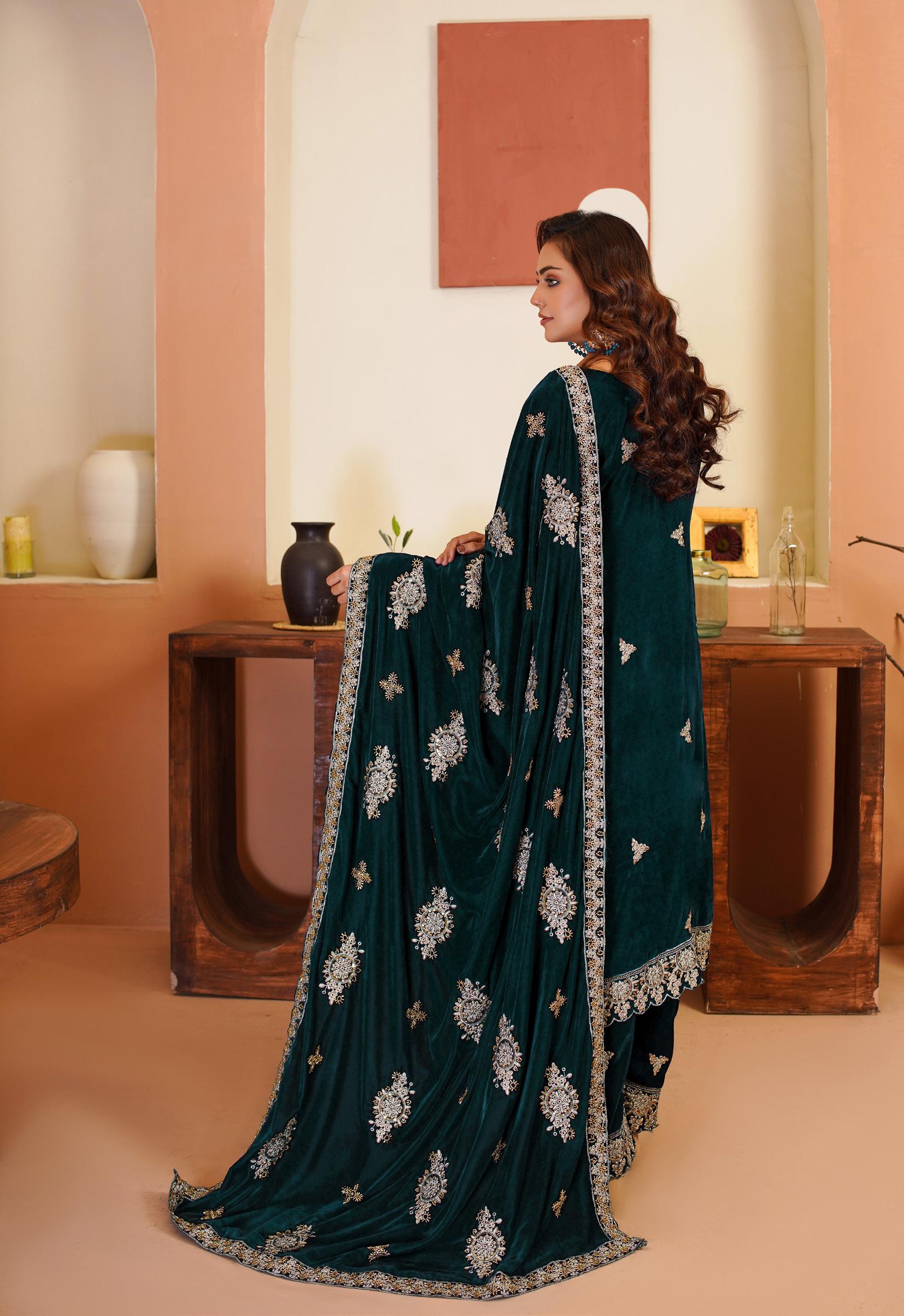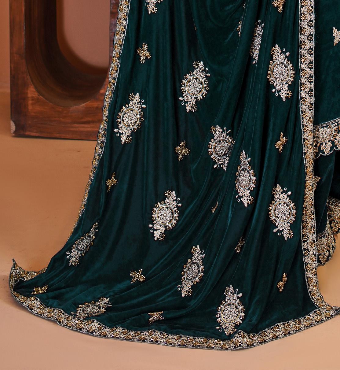 Hand work Embroidery sleeves with Heavy embroidered patti                                                  • Fully Embroiderey velvet fancy Dupata with hand beads work on it