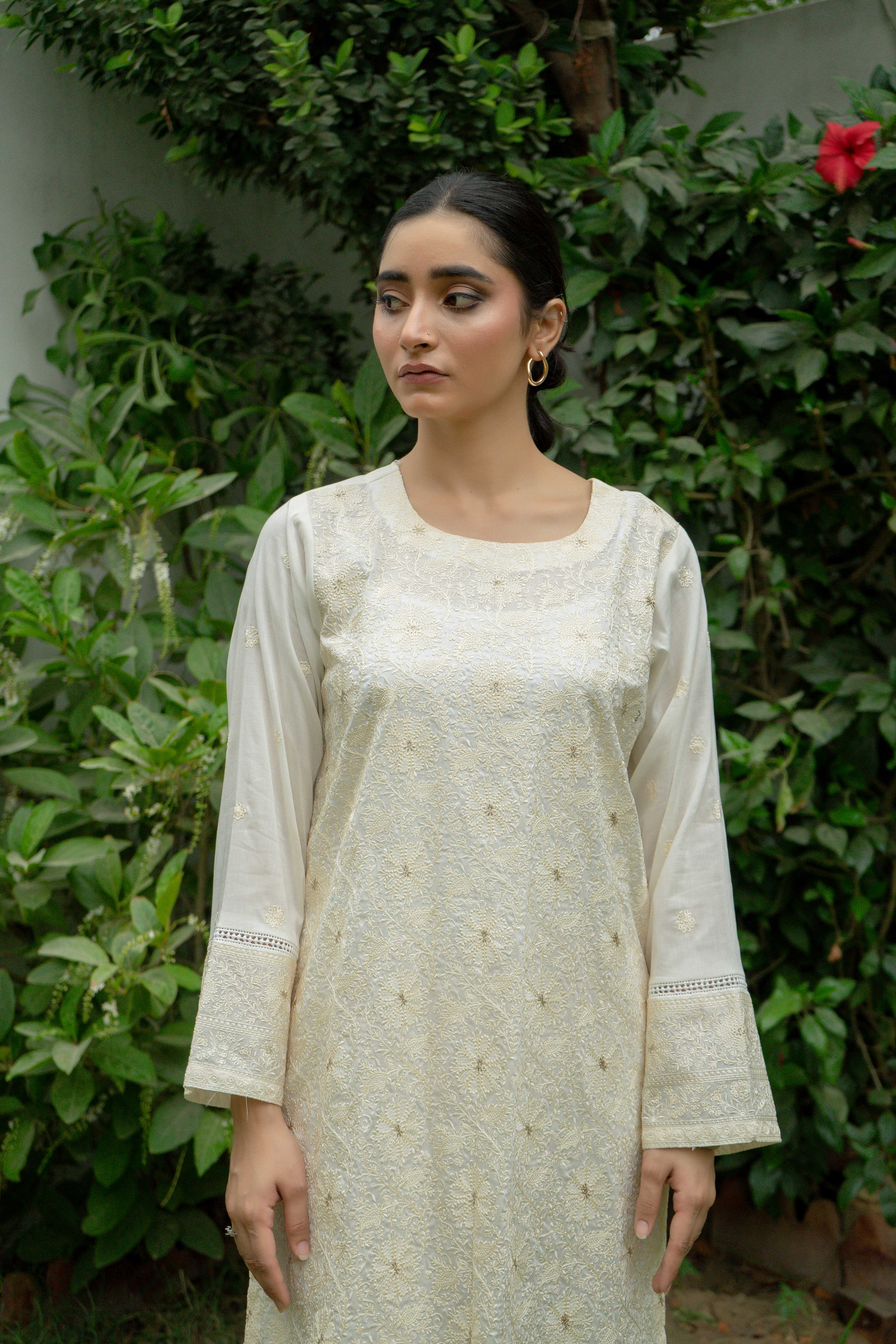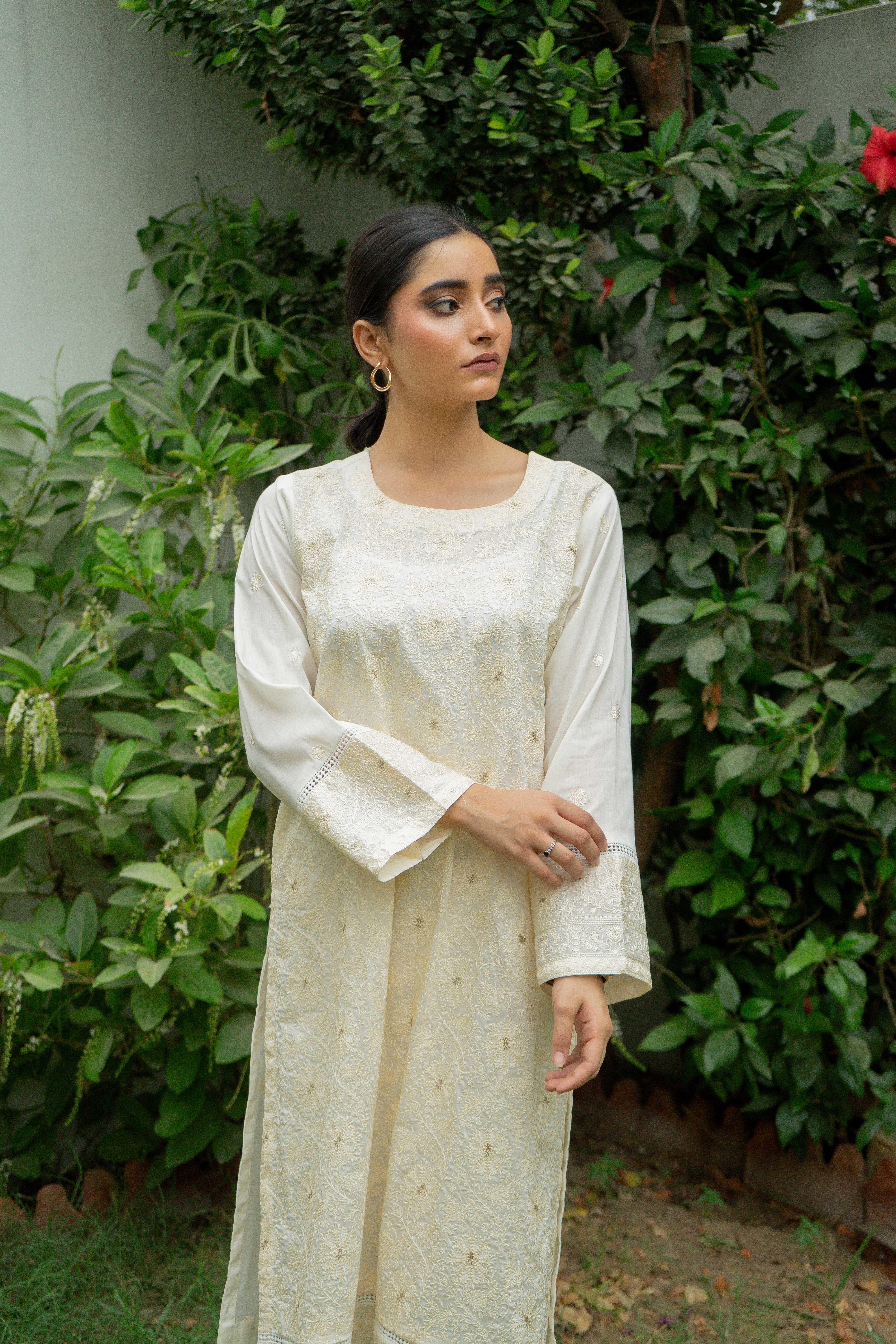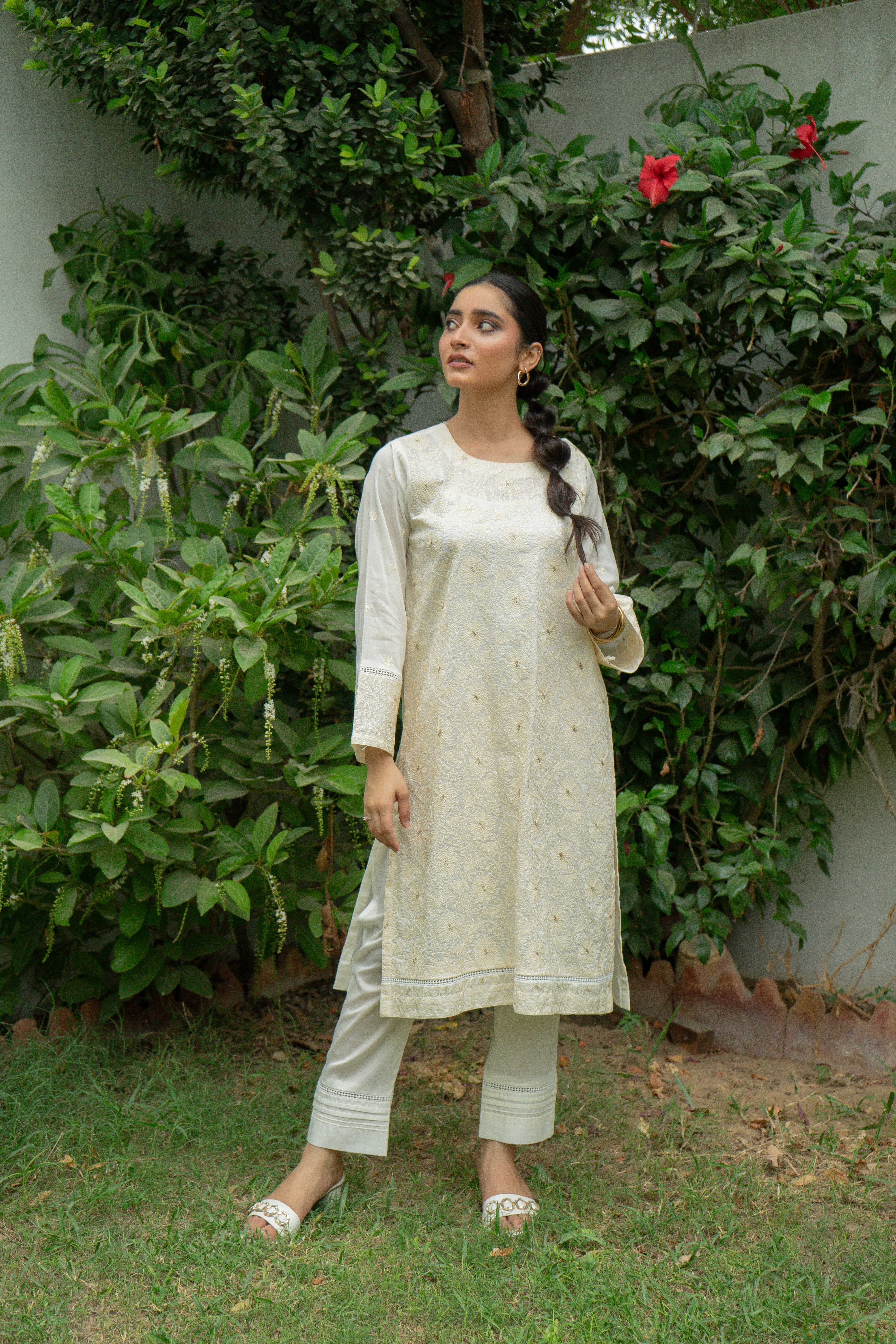 This elegant 2-piece ready-to-wear outfit is a beautiful choice for any event. The long, straight shirt is crafted from delicate lawn fabric with intricate all-over chikankari embroidery on the front. Embroidered back. The sleeves are also embellished with lace on the cuffs, adding a touch of sophistication. It is paired with simple yet stylish straight trousers with lace, creating a timeless and chic look.