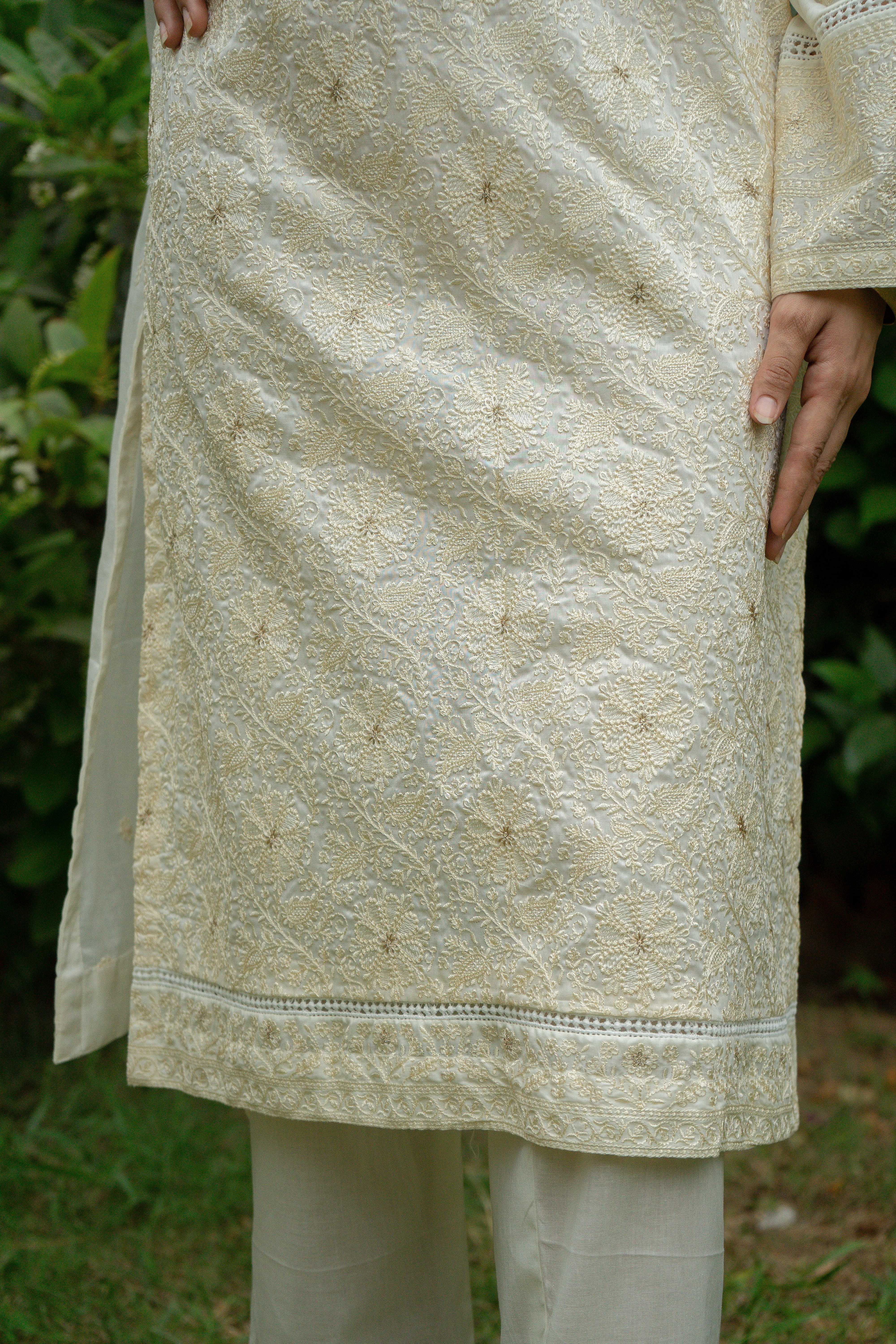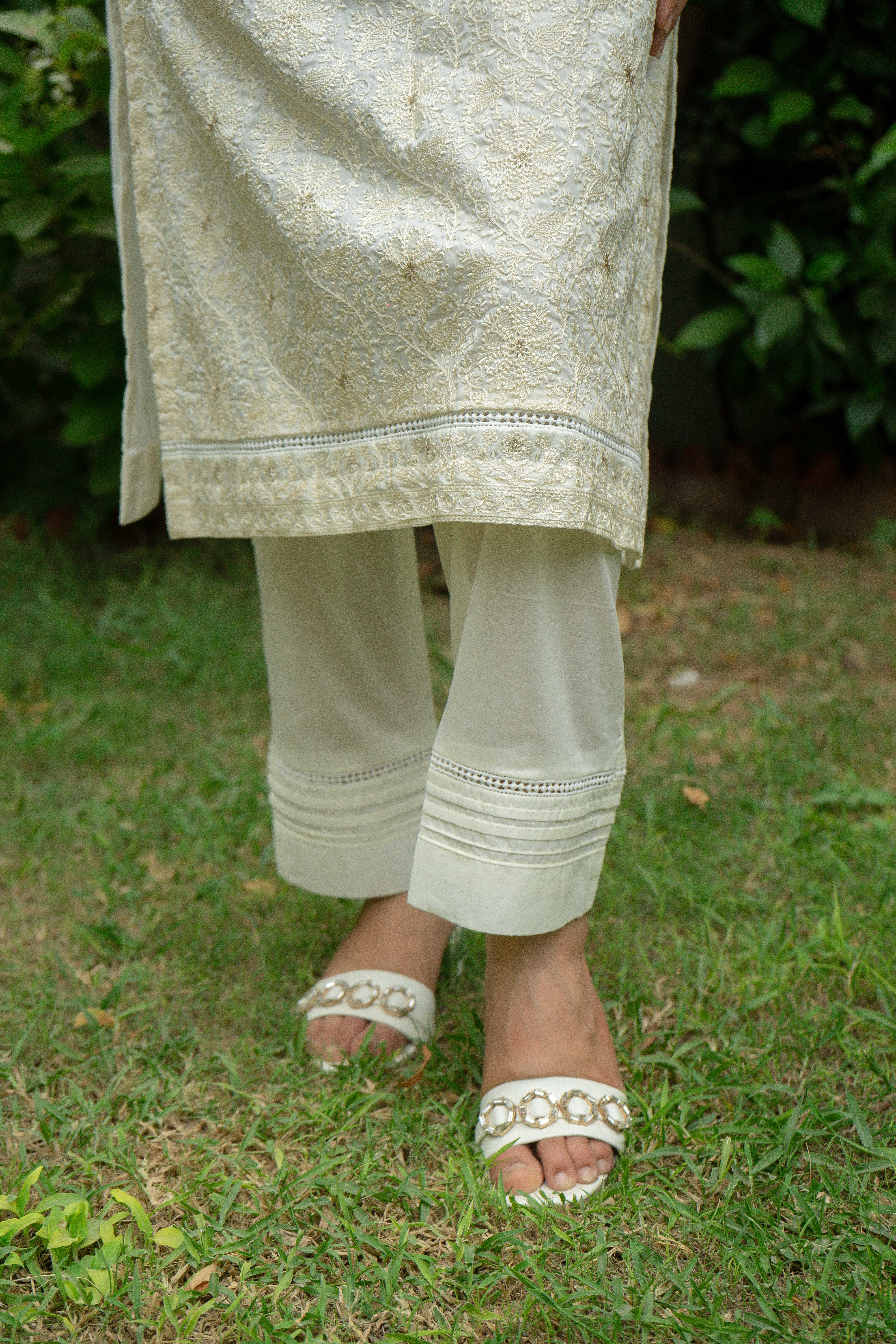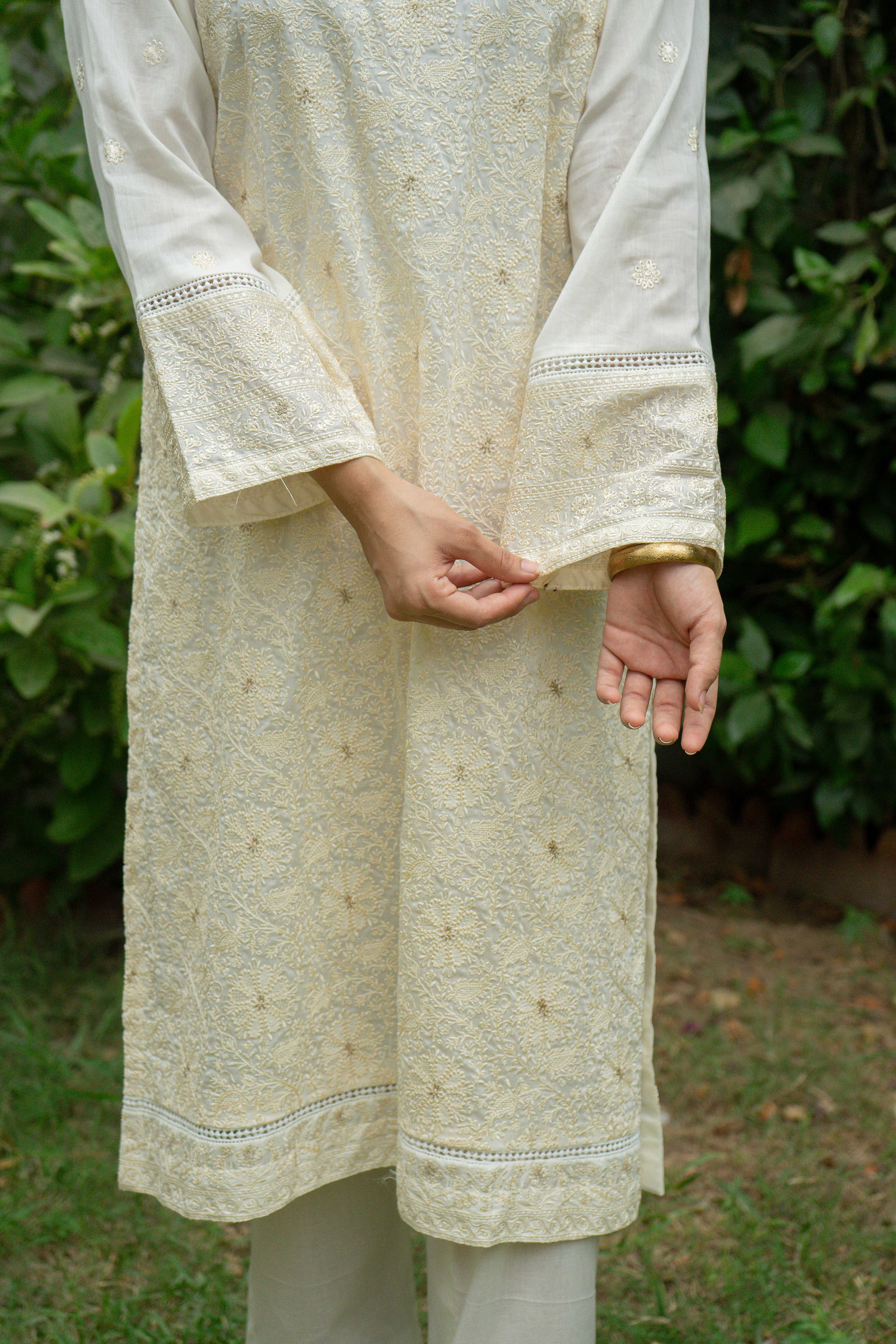 This elegant 2-piece ready-to-wear outfit is a beautiful choice for any event. The long, straight shirt is crafted from delicate lawn fabric with intricate all-over chikankari embroidery on the front. Embroidered back. The sleeves are also embellished with lace on the cuffs, adding a touch of sophistication. It is paired with simple yet stylish straight trousers with lace, creating a timeless and chic look.