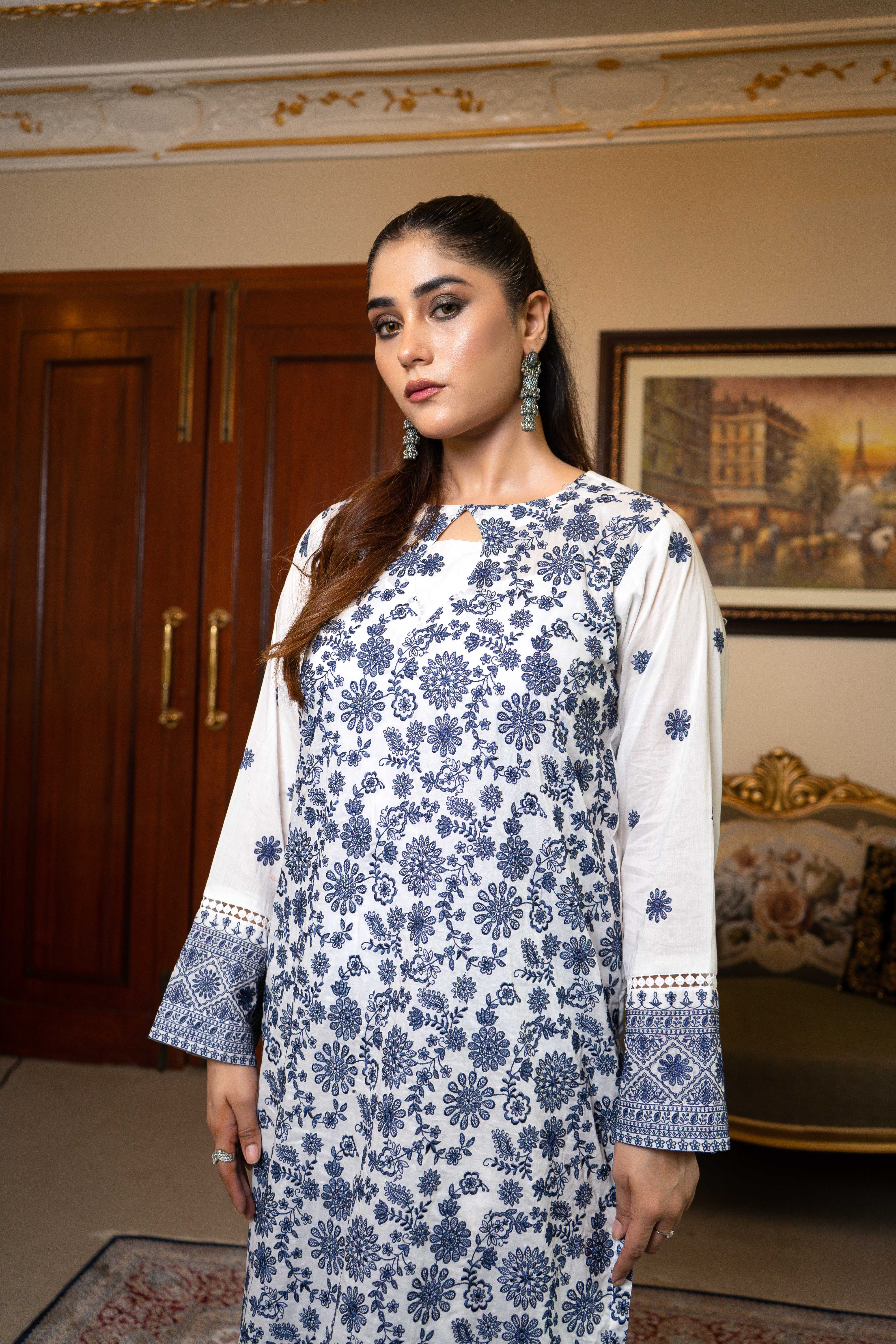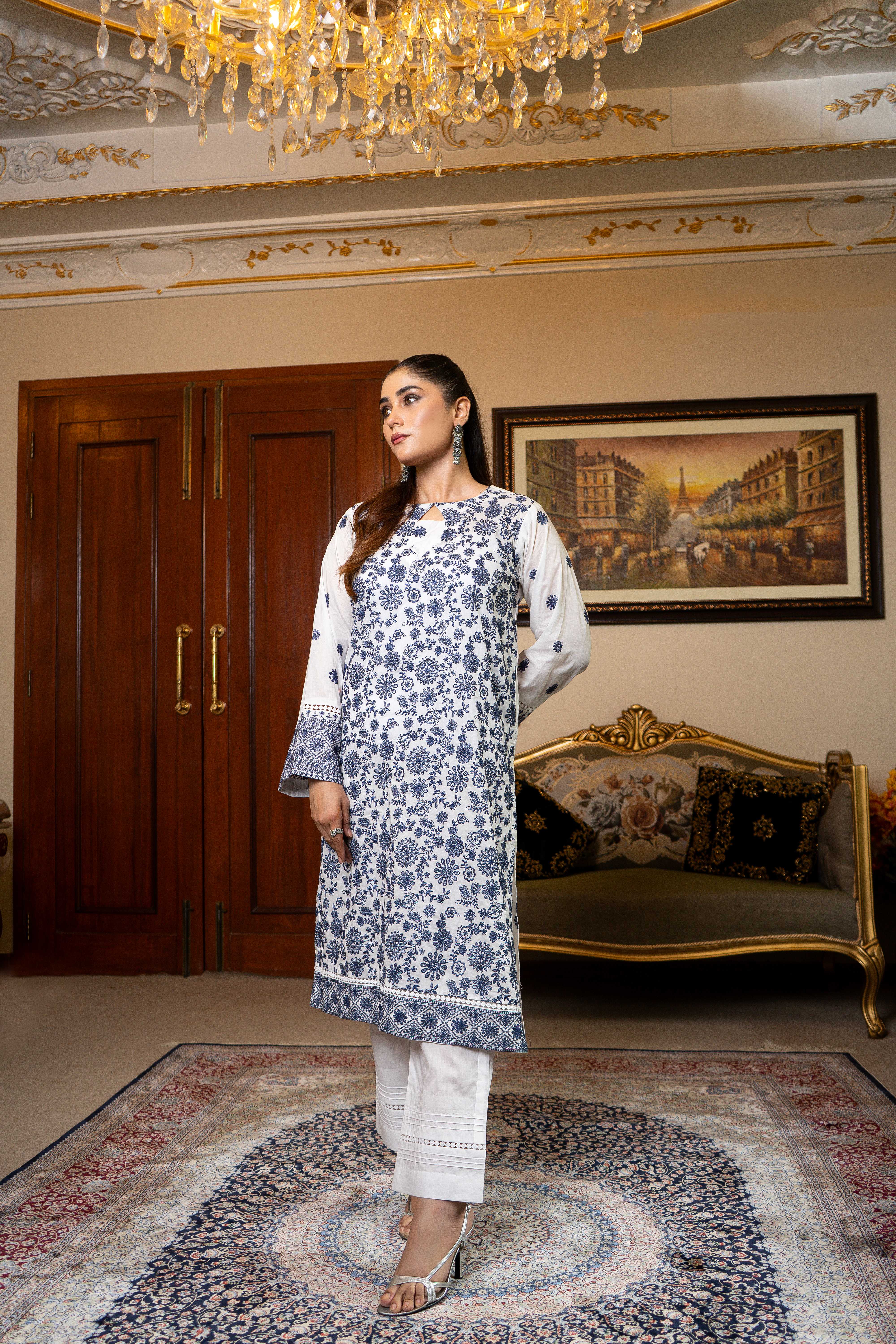 This classic 2-piece ready-to-wear outfit features a Heavily Chikankari embroidered Front. Embroidered back and sleeves . The stylish shirt includes a boat neckline and elegant embroidered borders on the sleeves and hem. It is paired with straight trousers having lace detailing, creating a timeless and sophisticated look perfect for any occasion.